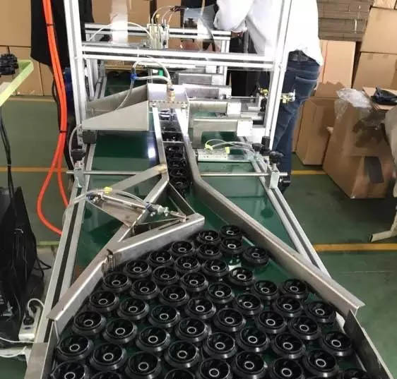 設備首先通過傳送帶和導軌將葉輪排成隊列,再通過分料氣缸將葉輪推入視覺檢測區域進行拍照檢測。當完成檢測后,輸出I/O信號給運動控制系統,執行剔除/通過動作。