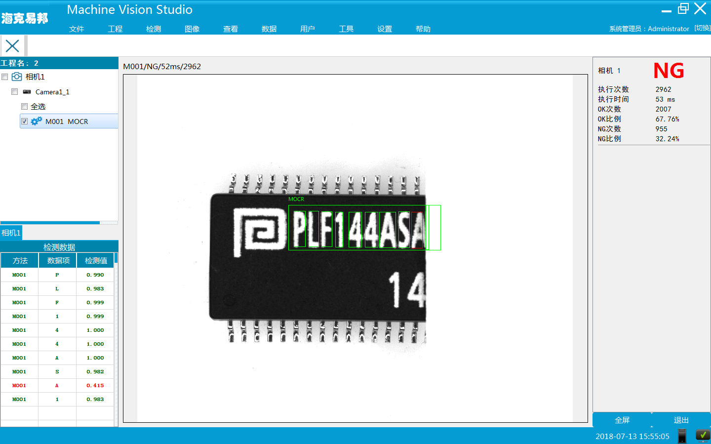 西安海克易邦光電科技有限公司基于機器視覺圖像處理技術研發(fā)的字符檢測系統(tǒng),具有高精度、高速、多樣品化的特點。系統(tǒng)主要模塊有:圖像處理模塊、控制模塊。根據(jù)用戶需求,樣品移動到檢測位,觸發(fā)相機并及時對視覺系統(tǒng)輸出檢測信號,從而完成檢測功能。產(chǎn)品到位后,系統(tǒng)識別字符信息;將識別到的信息與字庫信息進行匹配,且與設置字符對比是否一致;信息一致系統(tǒng)輸出OK信號,信息不一致時系統(tǒng)輸出NG信號。
